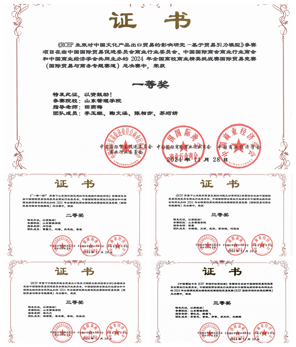 近日,2024年全国高校商业精英挑战赛国际贸易竞赛(RCEP 国际市场开拓策划赛道、国际贸易与商务专题赛道)全国总决赛落下帷幕,我院2022级国际经济与贸易专业的4支参赛团队凭借扎实的专业知识和实践能力获国际贸易与商务专题赛道一等奖1项、二等奖1项、三等奖2项及RCEP国际市场开拓策划赛道三等奖1项的优异成绩,指导教师田燕梅、闫付美、陈蕾、侯元元、曹红玉、臧雪飞等获“优秀指导教师”称号。