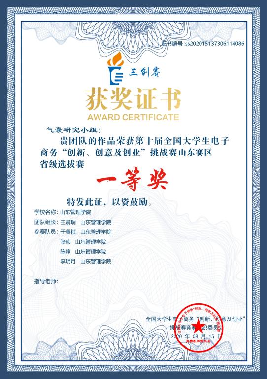 近日,第十届全国大学生电子商务“创新、创意及创业”挑战赛山东赛区选拔赛顺利闭幕。由我校经贸学院学生杨晨、王周通、王浩琛等组成的“疫”气风发小分队报送的作品《电商抗疫显身手,同舟共济助万家》获山东省特等奖的优异成绩,为我校参加该项赛事以来取得的最好成绩;经贸学院学生王晨瑞、于睿祺、张韩等报送的《宝贝气囊,保驾护航》项目也取得了省赛一等奖的好成绩。