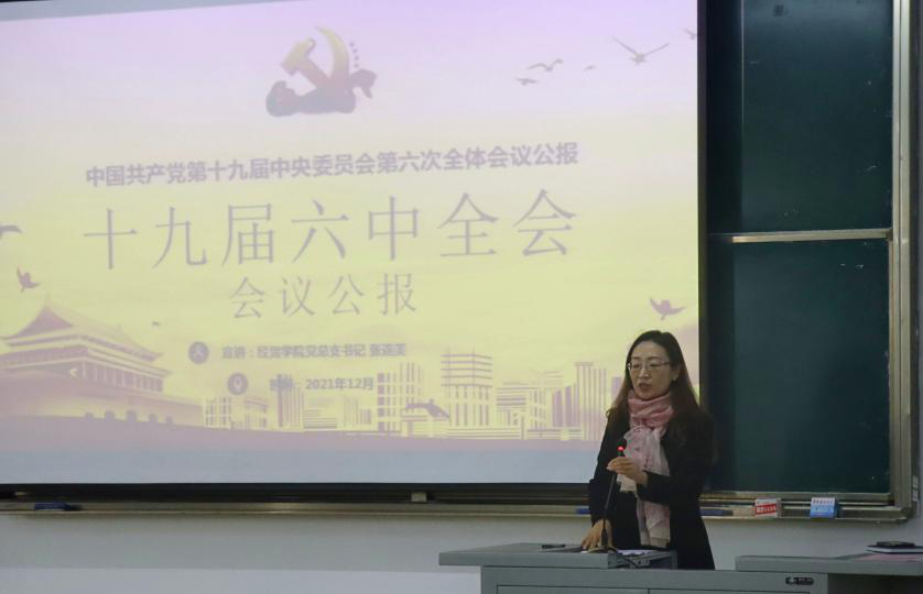 为深入学习贯彻党的十九届六中全会精神,深入领会全会精神内涵,2021年12月1日下午,经贸学院2020级入党积极分子培训班开展集中理论学习。学院党总支书记张连美教授为入党积极分子进行了党的十九届六中全会精神宣讲。