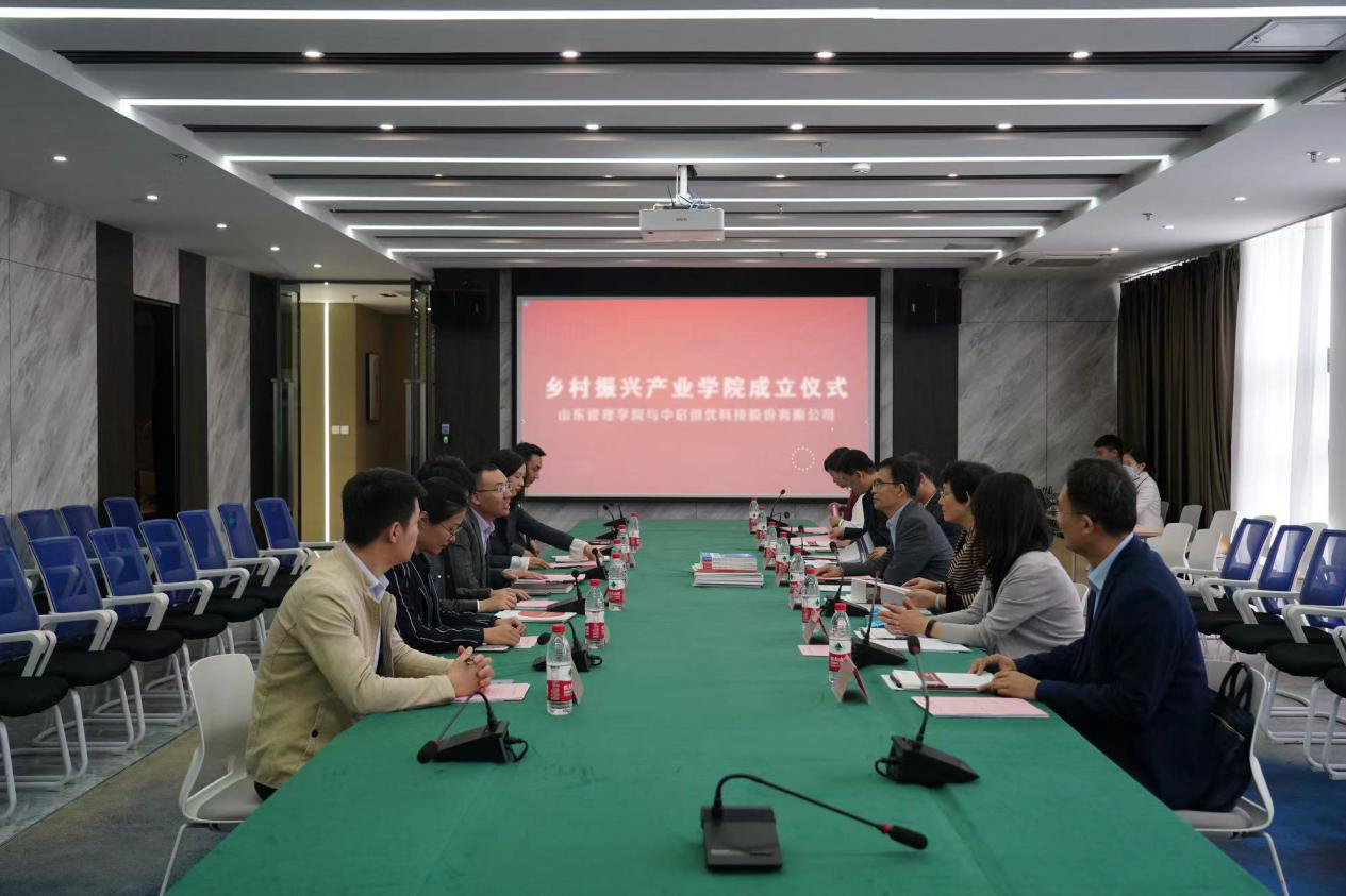 为贯彻国家有关战略要求,积极探索产教融合新模式,4月27日上午,我校与中启创优科技股份有限公司校企合作暨乡村振兴产业学院成立仪式在中启创优公司举行。中启创优科技股份有限公司董事长苏乐,总经理刘国卿,山东管理学院院长邹广德出席成立仪式,办公室、教务处、科研处、经贸学院负责人及相关人员参加。